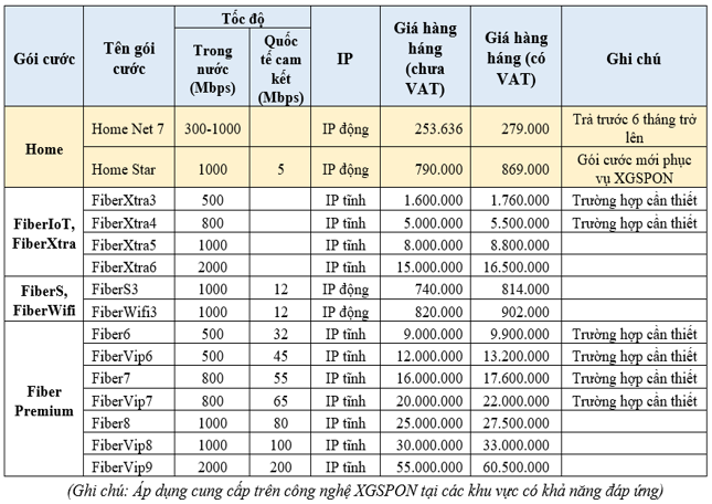 Lưu ý: Các gói cước Home Net7, Home Star, FiberS3, FiberWifi3 không cung cấp địa chỉ IP tĩnh